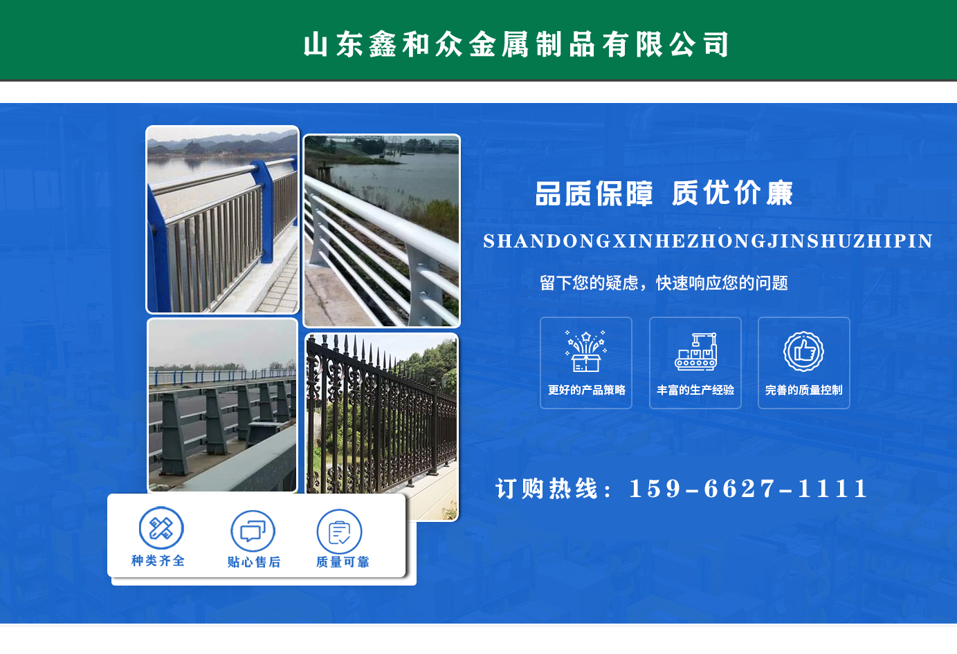 山東鑫和眾金屬制品有限公司主要產(chǎn)品有防撞護(hù)欄,橋梁護(hù)欄,道路護(hù)欄,河道護(hù)欄,不銹鋼護(hù)欄等護(hù)欄。提供設(shè)計(jì)方案,一站式定制,包您滿意價(jià)格優(yōu)惠,歡迎來(lái)電咨詢! 公司常年從事銷售護(hù)欄防撞護(hù)欄,橋梁護(hù)欄,道路護(hù)欄,河道護(hù)欄,不銹鋼護(hù)欄,橋梁鋼護(hù)欄,河道燈光護(hù)欄等。產(chǎn)品廣泛應(yīng)用于橋梁、河道、旅游景區(qū)、道路、公路、公園、小區(qū)、景觀、道路防撞等領(lǐng)域。 公司產(chǎn)品均采用優(yōu)質(zhì)不銹鋼材料,符合相關(guān)標(biāo)準(zhǔn)。各種型號(hào)不銹鋼復(fù)合管及護(hù)欄,質(zhì)量嚴(yán)格把控。產(chǎn)品強(qiáng)度高、耐腐蝕、焊接牢固、抗沖擊、性能好,防撞護(hù)欄結(jié)構(gòu)簡(jiǎn)單、美觀實(shí)用大方。 歡迎前來(lái)訂購(gòu)!...